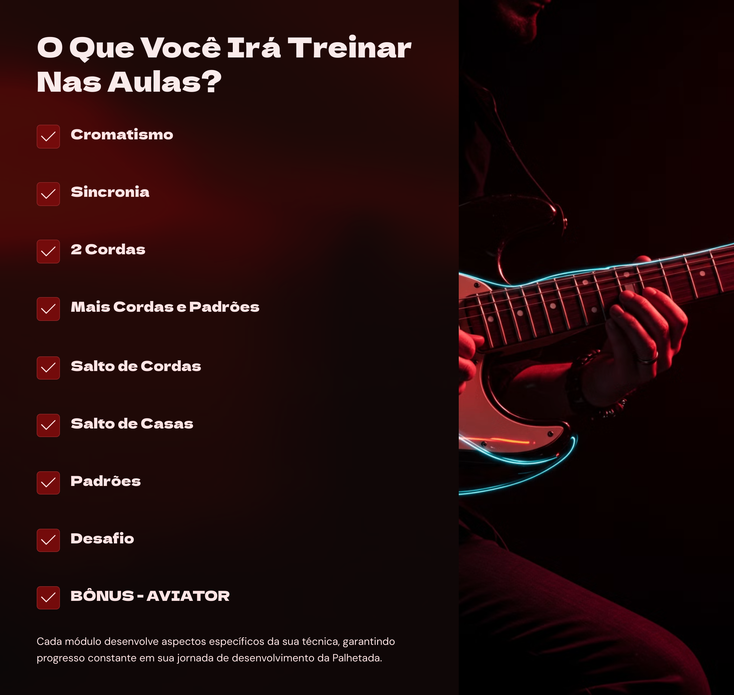 É para quem sente e quer melhorar sua forma de tocar guitarra técnicamente falando. São aulas que vão desde exercícios simples até mais complexos.