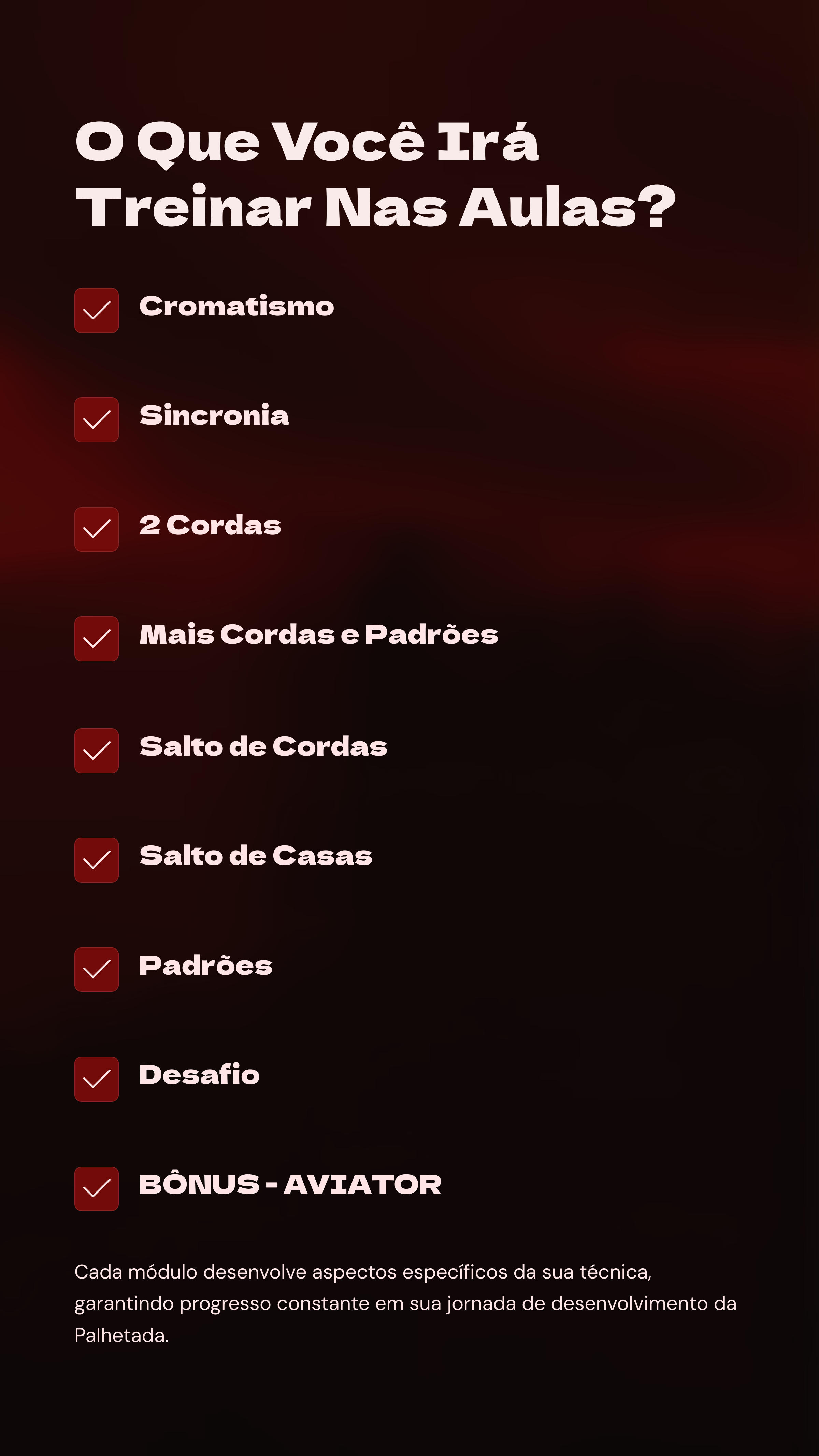 O "Desenvolva sua Palhetada Alternada" é o método que já ajudou centenas de guitarristas a desenvolverem uma técnica limpa, rápida e precisa. Aqui, você vai aprender exercícios do iniciante ao avançado, aprimorar sua coordenação e elevar sua palhetada a um nível profissional.